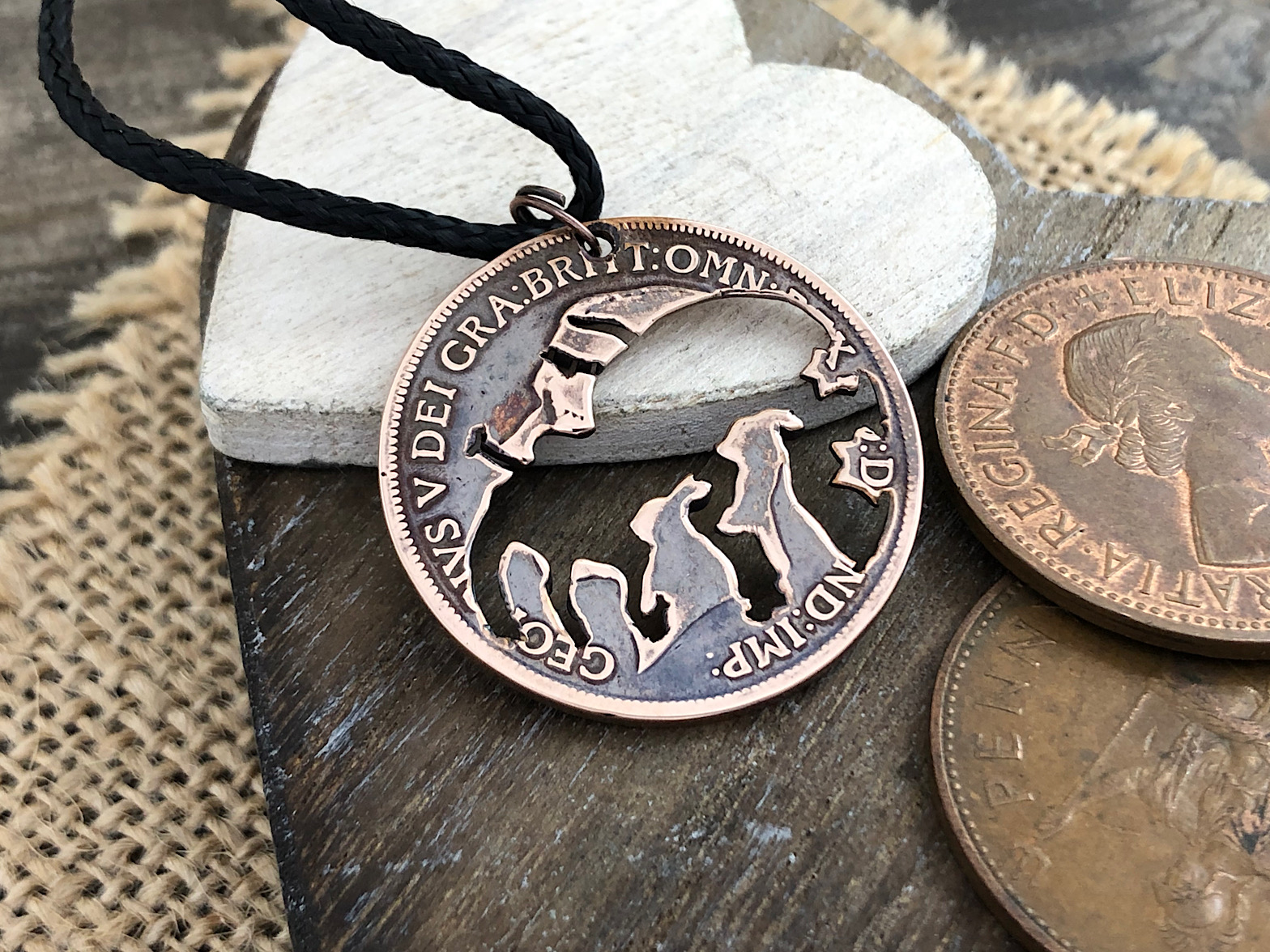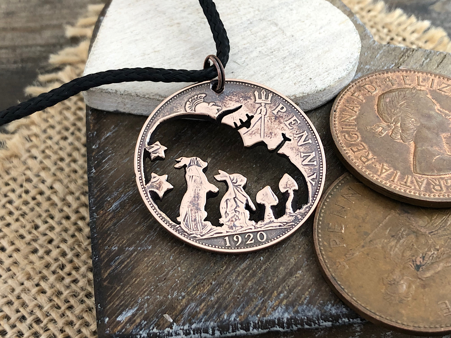 As with all my pieces, this piece has been cut and engraved by hand using traditional tools. This piece has been cut into a pre-1967 bronze penny and comes on a black polyester cord made from recycled bottles. The coin used has a diameter of roughly 30mm.