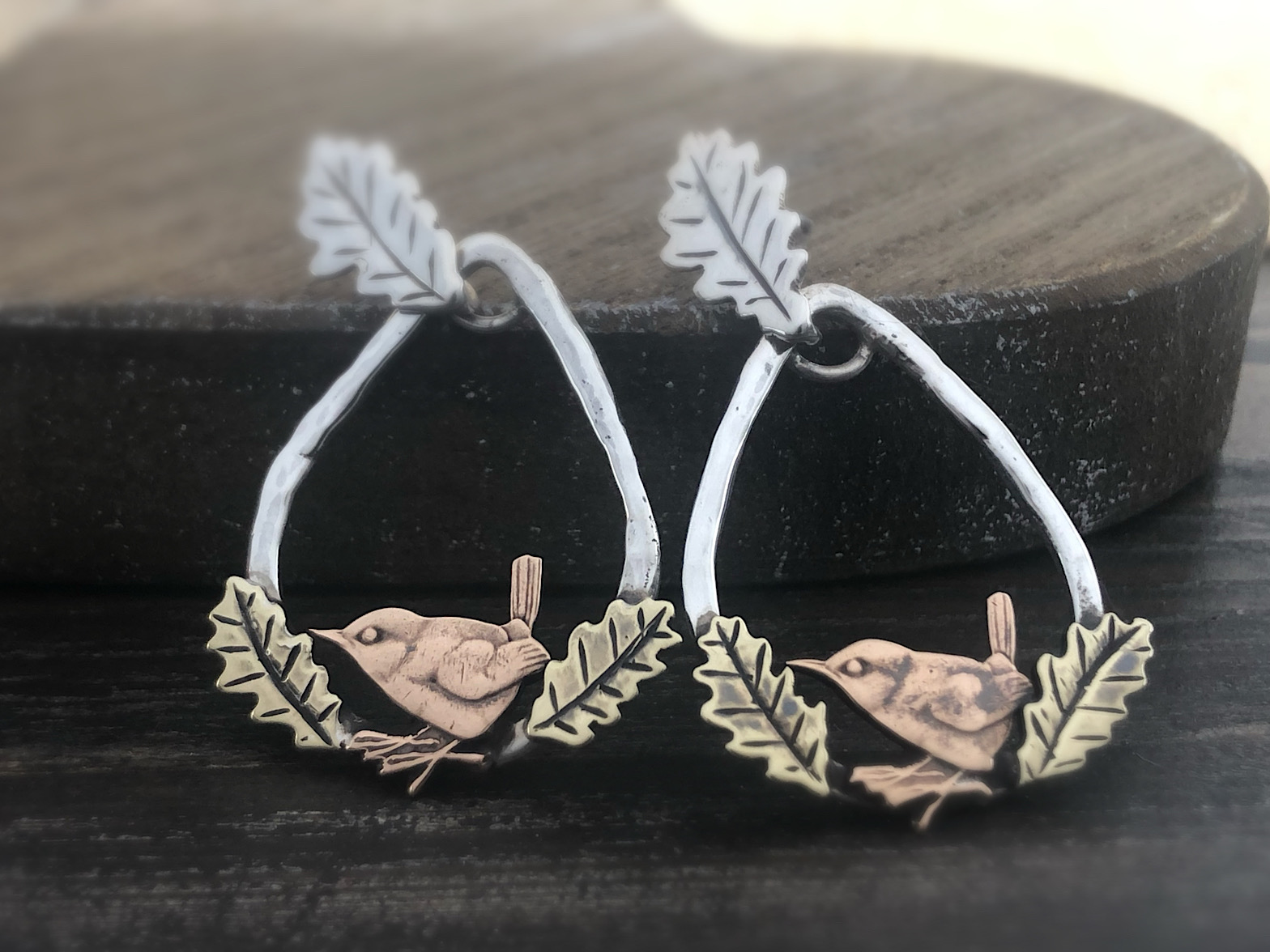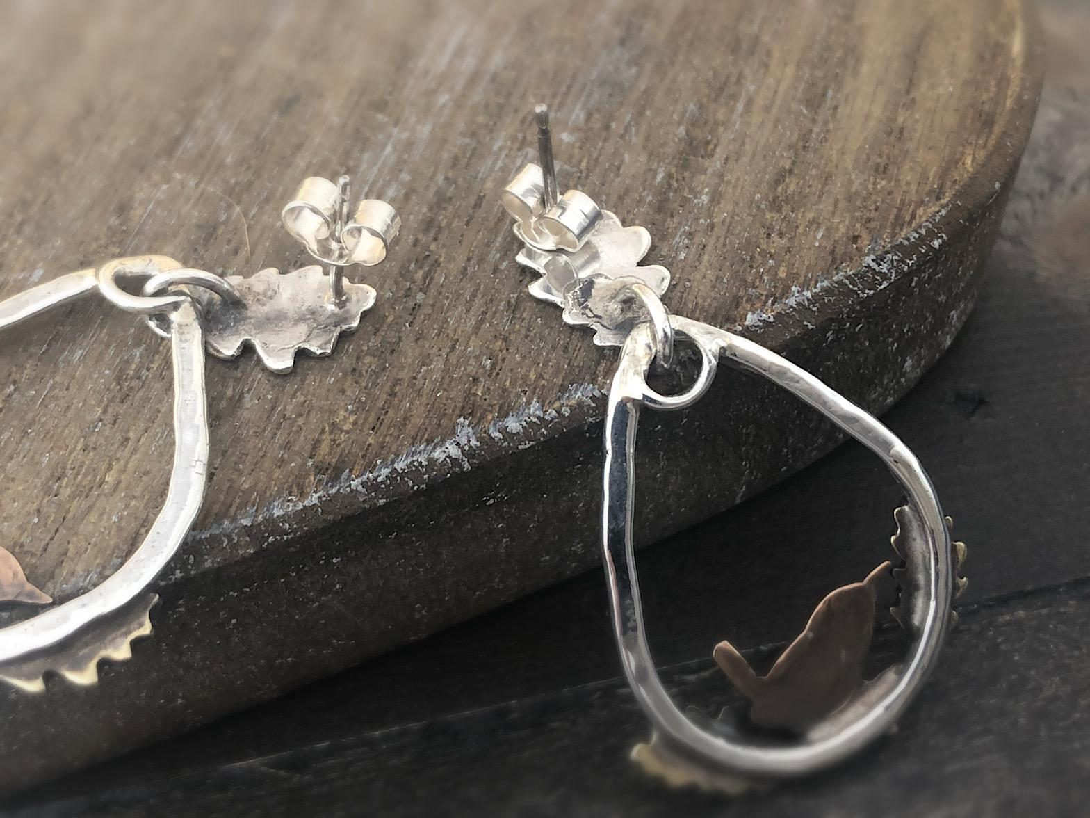 Jenny Wren and her friend are bouncing around in the autumn leaves within these raindrop shaped earrings. Made from recycled silver, brass threepence, and a bronze farthing. Every part has been hand cut and engraved with traditional hand tools to create this little scene. The tiny brass and silver leave have real leaf textures pressed into them to give them a wonderful natural look. This piece comes boxed and on an 18inch .925 silver chain.