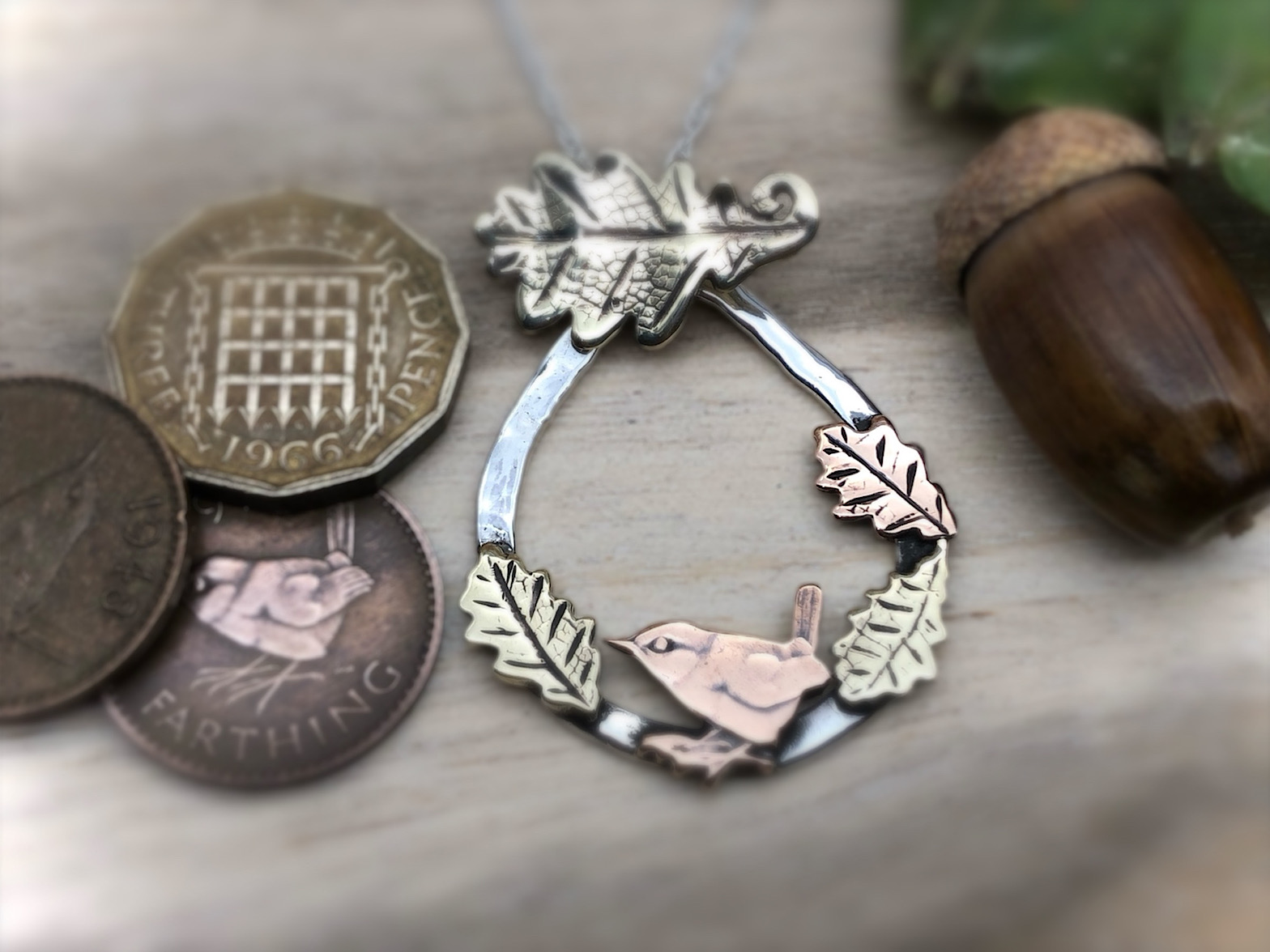 Jenny Wren is bouncing around in the autumn leaves within this raindrop shaped piece. Made from recycled silver, brass threepence, and a bronze farthing. Every part has been hand cut and engraved with traditional hand tools to create this little scene. The tiny bronze and brass leave have real leaf textures pressed into them to give them a wonderful natural look. This piece comes boxed and on an 18inch .925 silver chain.