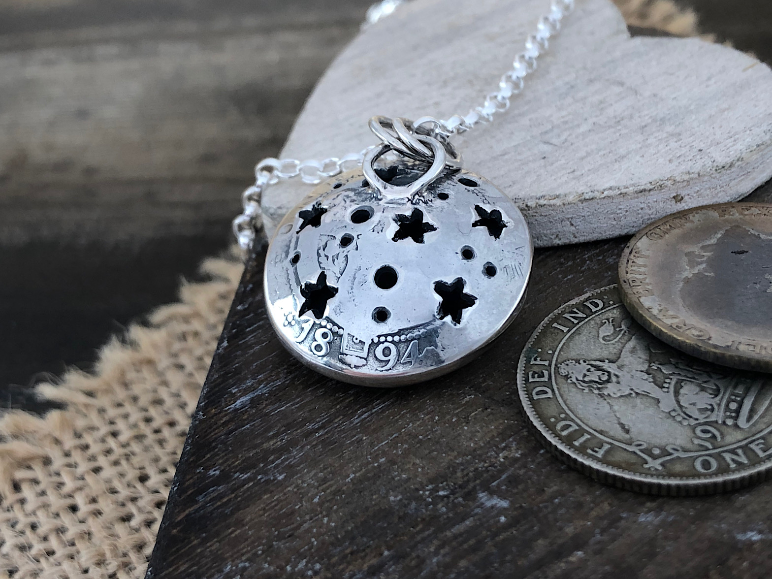 The coins used in this piece are three sterling silver shillings (pre-1920). The top and middle layers have been flattened out and then cut and engraved with traditional hand tools. The reverse of the piece will have all that lovely coin detail from the shilling with little stars cut into it. With the reverse being unflattened it still has the coins date and all that lovely history on show. The piece comes on an 18inch silver (.925) chain.
