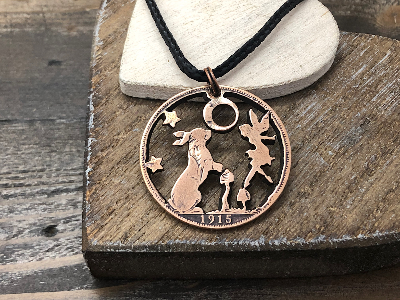 As with all my pieces, this piece has been cut and engraved by hand using traditional tools. This piece will be cut into a pre-1967 penny and comes on a black polyester cord made from recycled bottles.