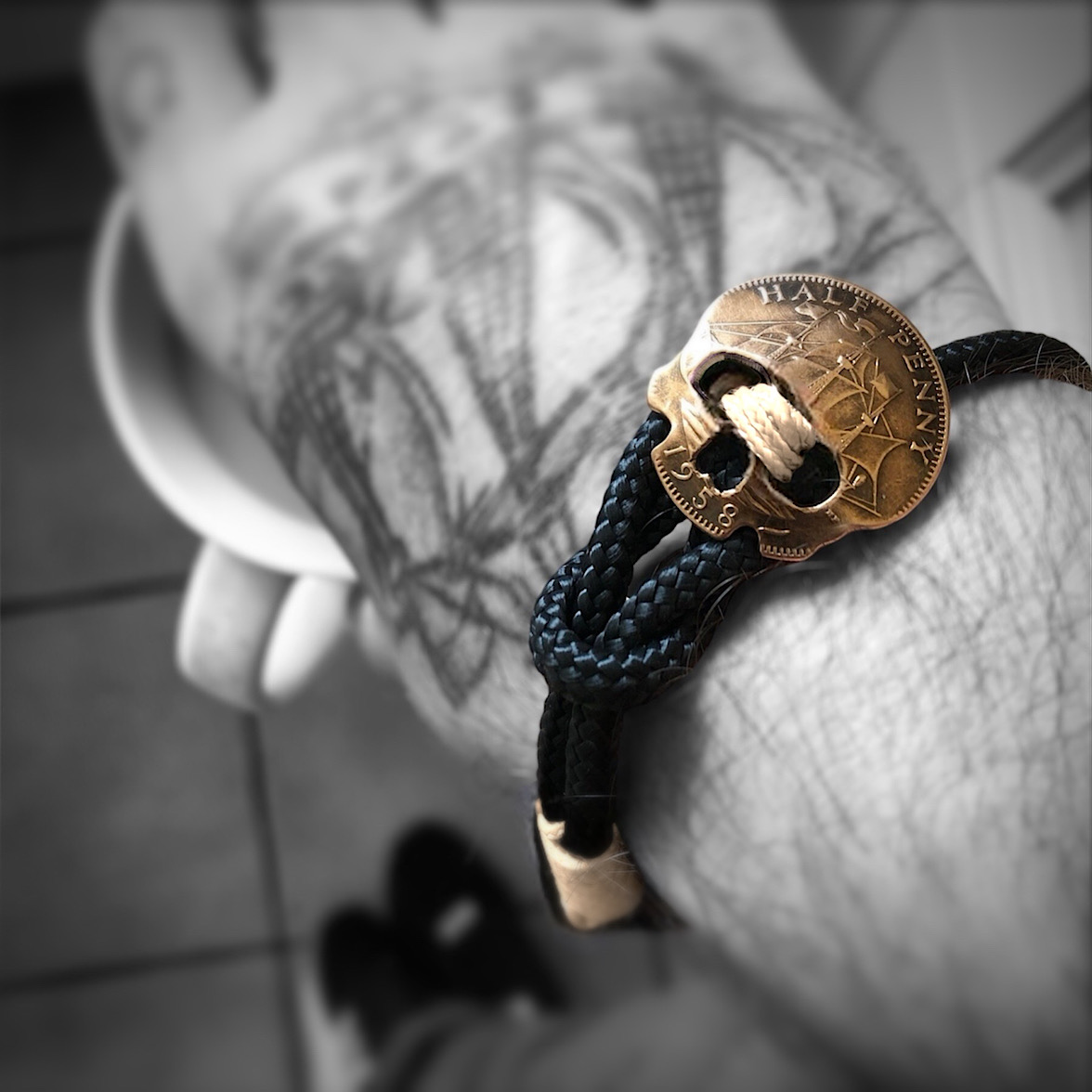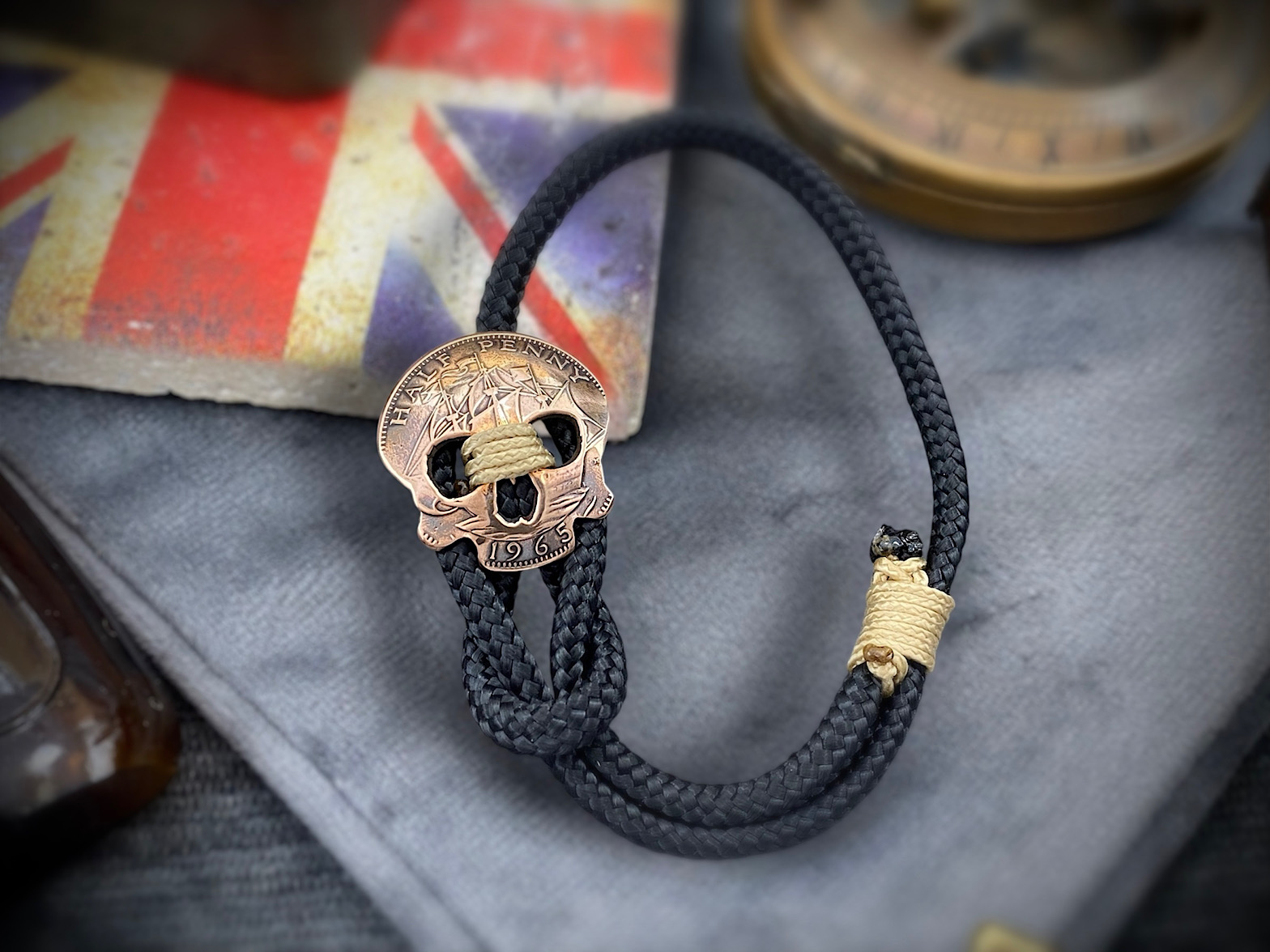 Each of these adjustable, hardwearing bracelets have button clasps that are made from recycled Half penny coins. From every angle this unique button clasp shows its  history and unique charm. The cord is from recycled plastic bottles and is doubled up and adjusted with a sliding knot that gives the piece a lovely natural colour accent.