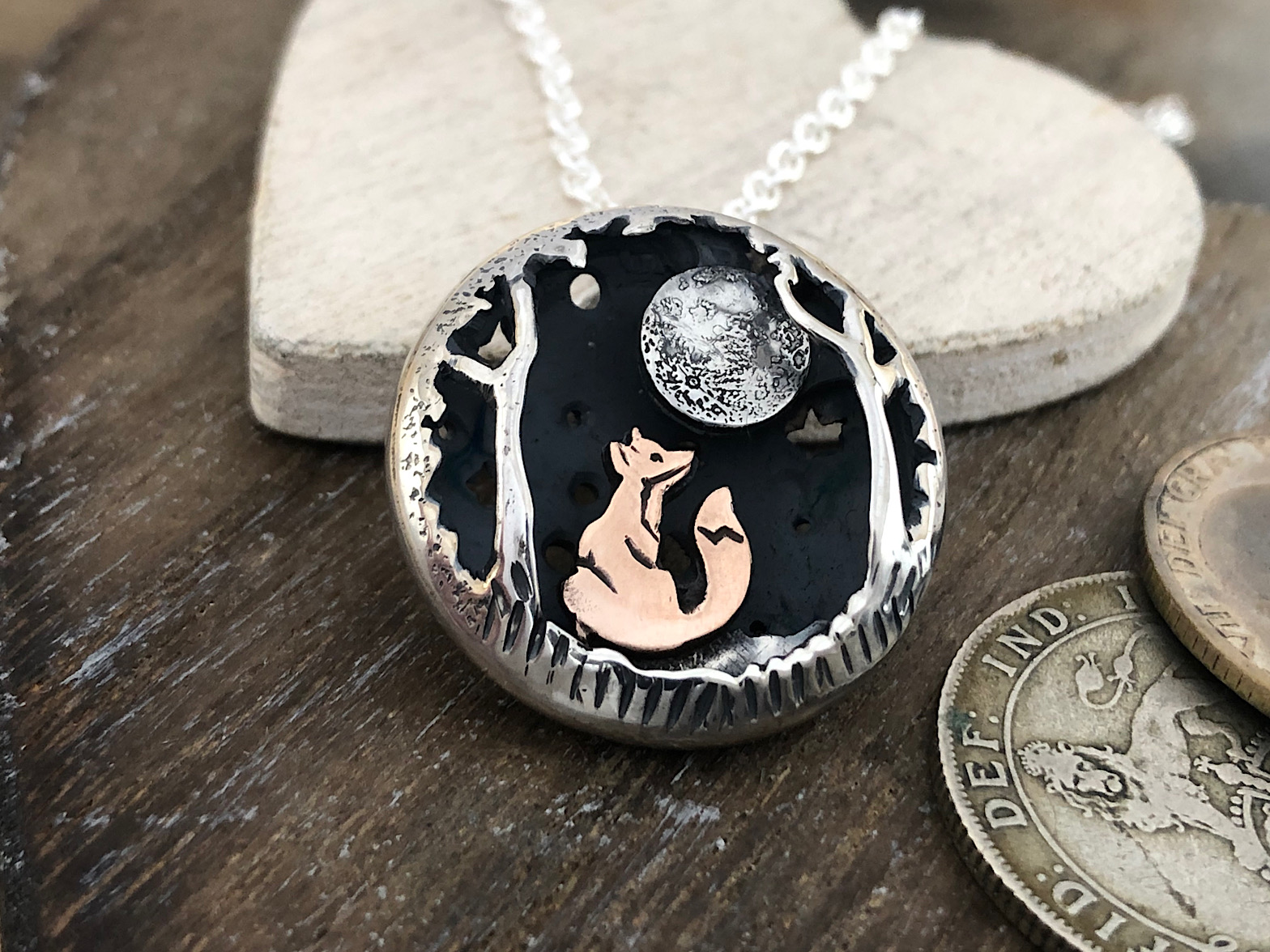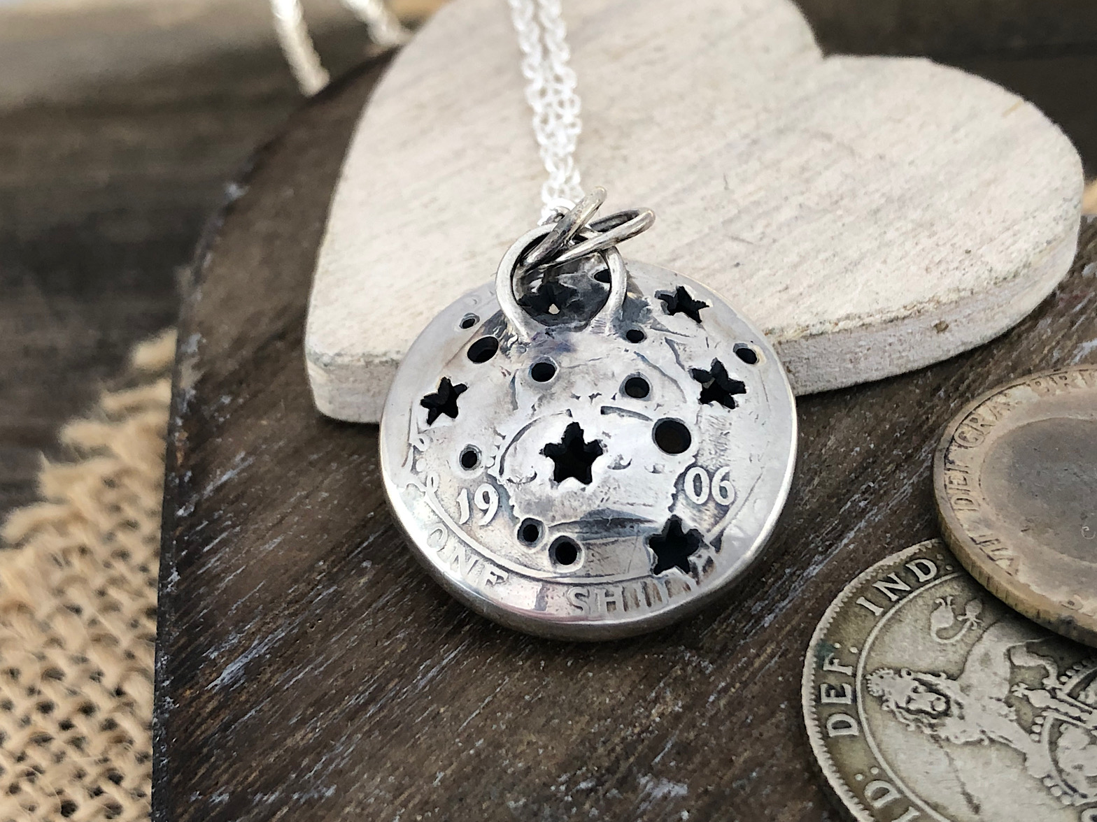 The coins used in this piece are three sterling silver shillings (pre-1920) and a flattened out 1/2 penny for the little fox. The top and middle layers have been flattened out and then cut and engraved with traditional hand tools. The reverse of the piece is a complete shilling with little stars cut into it. With the reverse being unflattened it still has all the coin detail and all that lovely history on show including the pre-1920 date. The piece comes on an 18inch silver (.925) chain.